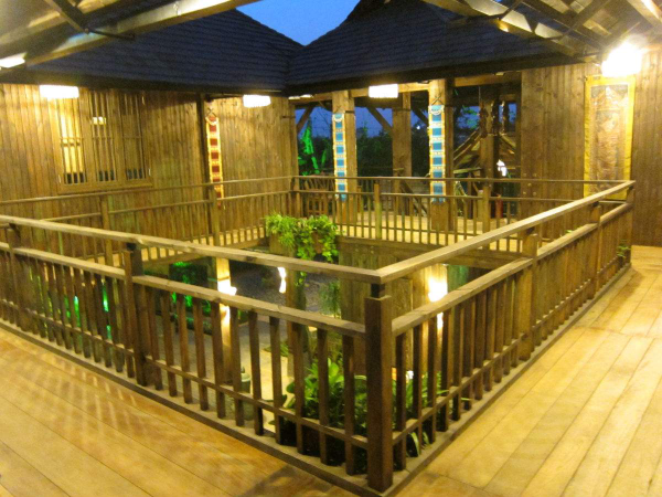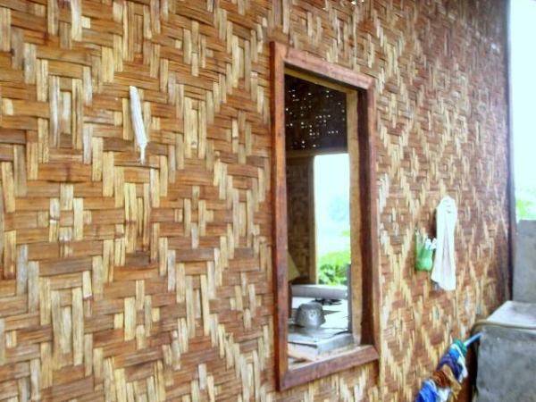 上層近梯處有一露臺,轉進為長形大房,用竹籬隔出主人臥室并兼重要錢物存儲處。其余為一大敞間,屋頂不甚高,兩邊傾斜,屋檐及于樓板,一般無窗。若屋檐稍高則兩側開有小窗,后面開一門。樓中央是一個火塘,日夜燃燒不熄。屋頂用茅草鋪蓋,梁柱門窗樓板全部用竹制成。