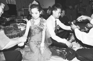 2013年11月19日,在人們“水——水——水——”的祝福聲中,漢族小伙子戴龍與傣族姑娘玉金喜結(jié)良緣。在云南西雙版納傣族自治州景洪市曼嘎村舉行的傳統(tǒng)傣族婚禮上,長(zhǎng)輩們紛紛為新人誦經(jīng)、拴線、灑水祝福。
