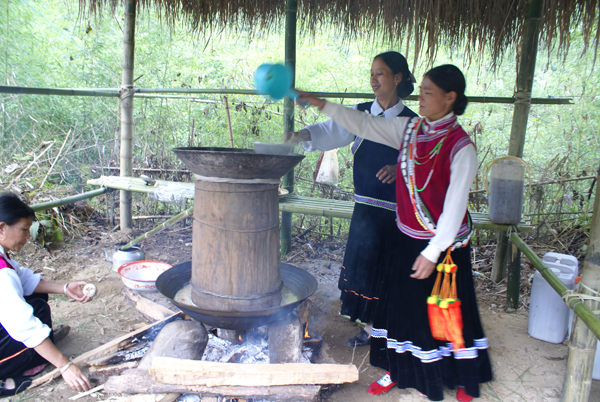傈僳族一般居住在高山峽谷地帶。新中國成立前,生產力水平低下,人們往往早出晚歸,途中常常忍饑挨餓,而帶食物之類又不方便,于是,他們在長期的生產勞動過程中知道吃干飯比稀飯耐饑,這樣,就形成了傈僳族以“干”為主的飲食習慣:如蒸玉米面,由于傈僳族人耕種的土地大都離村寨比較遠,需爬坡走箐,體力消耗大,勞動歸來人們極想喝上幾口“飯湯”解渴、止餓,這樣,又形成了傈僳族以玉米稀飯為主的各種“稀”食輔之于“干”食的飲食習慣。新中國成立前,大部分傈僳族地區地多田少,主要糧食作物為玉米、旱谷、小麥、蕎麥、高粱等,這樣,傈僳族以玉米為主食,輔之以小麥、旱谷、蕎麥、大米等。副食有肉禽蛋類,但較少,主要還是上山獵取動物輔之。蔬菜、水果種類也不多。