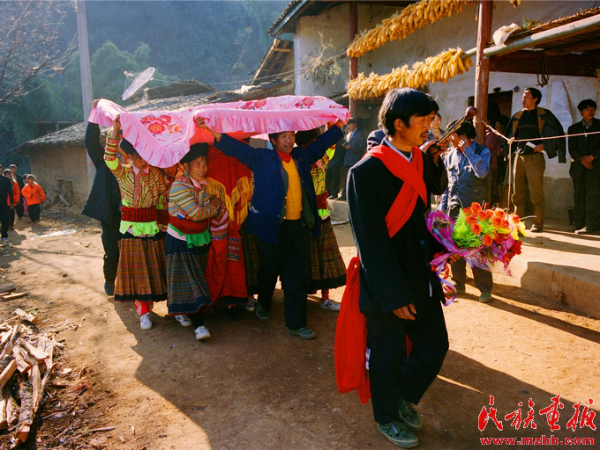 山歌你問我答,感情真摯動人,讓在場人十分酸楚。不知不覺送親的時間到了,在主持人的催促下,依依不舍的女兒才叩拜父母、叩拜家神,在葫蘆笙手的領親曲中緩緩啟程。出堂屋跨門檻時,舅母幫張正秀提起裙擺,其意是不讓新娘把娘家的財運掃走。