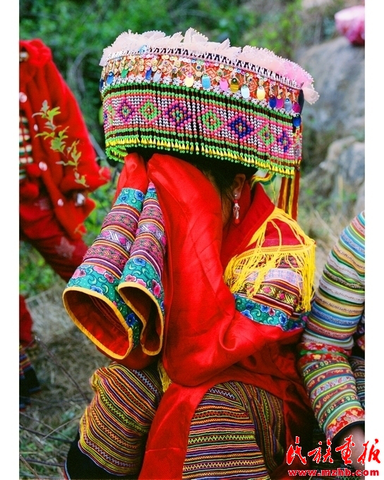 刮臉回來后,張正秀就由姐妹陪伴在閨房。屋外送親的酒席在熱鬧中開席時,舅母就回到閨房里為她洗臉洗腳,改換嫁衣。按傳統習俗,要把新娘用過的水潑灑在閨房的地上,以示吉利。新娘穿上由親人縫制的繡花衣裙,從頭到腳煥然一新。穿戴整齊后,新娘由伴娘陪同坐在閨房門旁的草地上接受祝福。女方家請的懂禮儀的阿巴莫(司儀)手持菜花和松針葉在堂屋敬女方家神,告訴家神姑娘要出嫁了,并給前一天夜里來新娘家領親的兩位娃拿扒(證婚人)挎上兩條交叉打結的紅布,表示娃拿扒已承諾為女方家領親。