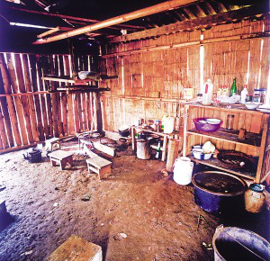 房內一般隔成里外兩間,里間狹小,光線暗,是主人的臥室,只放雙人床和一小部分生活用品。外間寬大,是生火煮飯、聚會待客和子女就寢的地方。火塘設在里間屋的門外,放鐵制三腳架,三腳架對應的方位有固定的用途,即靠里間房門一方為主人的座位,靠外間房門一方為客人的座位,火塘上方靠墻處為子女的床位。如有成年子女和新婚夫婦,則在外間再隔出小間,里間和外間存放著生產用具和酒具。房內幾乎沒有什么家具和裝飾性的陳設,有的甚至沒有桌椅和床鋪,只在火塘周圍鋪著竹席或木板,合衣向火而眠。火塘上面1米多高處懸掛著竹編的約1米見方的架子,上面放著食具、鹽巴、辣椒等,也是烘烤牛肉干的地方。架子上面靠房頂處并排放著幾個粗大的竹筒,里面存放糧食。這幾年的新村民居,在保持傳統民居特征的前提下使用了新型建材,更堅固,更舒適。