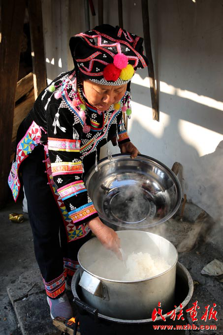 張俊波的母親燜了一鍋糯米飯,準備舂粑粑