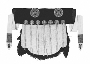 剪裁時(shí),將羊皮修剪成U型,上部橫鑲一段黑氆氌(毛織品)或黑呢子,內(nèi)襯天藍(lán)色棉布。其下用七對(duì)白色鹿皮條穗縫綴并列的七個(gè)小圓形彩線(xiàn)繡花布盤(pán),肩部縫綴兩個(gè)大圓形彩線(xiàn)繡花布盤(pán)。羊皮上端縫釘兩條繡花白布長(zhǎng)帶,帶端還繡有花鳥(niǎo)、魚(yú)蟲(chóng)、動(dòng)物、植物、幾何等圖案,據(jù)說(shuō)是象征納西族人民如蜂似蝶地奔忙,以辛勤勞動(dòng)換取甜蜜生活。