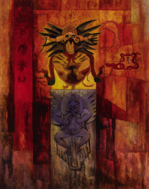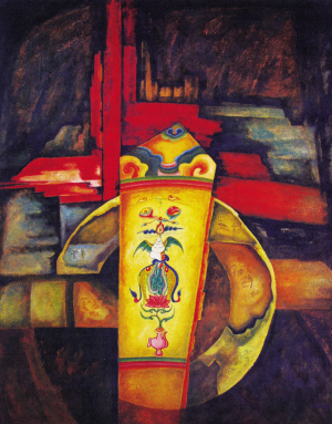 我以前所結識的一批納西族畫家差不多都是上世紀四五十年代出生的,他們大多接受過美院等高等藝術院校的教育,具有堅實的繪畫功力,有相同的美學見解和共同的探索形成的藝術追求。它一出現就以其獨特的美學傾向和特殊的藝術魅力引起世人的關注。而和向東是上世紀70年代出生的青年畫家,他原來就讀于浙江大學的藝術設計專業,只因迷上美術學理論而走上了創作之路,沒有學院派的背景。他的家鄉云南麗江現在已是聲名鵲起,納西族東巴文化作為世界記憶遺產已聞名海內外。作為年輕一代的納西族畫家又該怎么表現東巴文化呢?這個學藝術設計的年輕人以設計師的獨特眼光和思維,一開始就與“現代東巴繪畫派”的中年畫家群體拉開了距離。其作品在保留古老的東巴繪畫藝術的基礎上,在作品中運用書寫東巴經卷的各種形象和文字符號。用當代人的思維觀念和審美意識,運用油畫的技法來表達。畫面大多用平面設計的構成原理,以裝飾性的、形式感極強的、既寫實又抽象的手法表現出原汁原味的納西文化。即使拋開作品主題內涵,依然可以從他的作品里感受到一種神秘、古樸、深沉的歷史基調。因4年前他的創作是在平面設計為主的業余時間里完成的,而真正投入精力進行專業創作是近兩年的事,因此,他現在處于學習、吸收、探索創作的過程中。