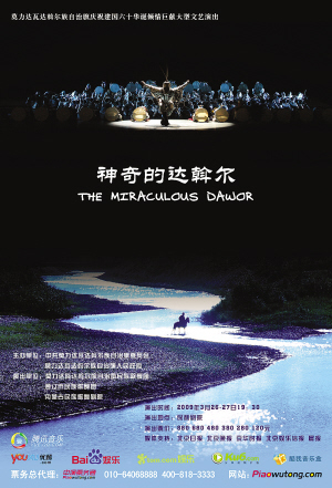 作為內(nèi)蒙古自治區(qū)莫力達瓦達斡爾族自治旗(以下簡稱“莫旗”)慶祝建國60周年的活動之一,2009年3月26日至27日,北京保利劇院迎來了一場名為《穿越千年——神奇的達斡爾》(以下簡稱“《神奇的達斡爾》”)的大型文藝演出。這臺主要由烏蘭牧騎傾情奉現(xiàn)的演出分《亙古風(fēng)云》、《山魂水魄》、《日月同歌》、《天地祥和》、《陽光燦爛映山紅》5部分,分別展現(xiàn)達斡爾族在歷史、文化、藝術(shù)、體育等多方面的成就和風(fēng)情,可謂一場立體的非物質(zhì)文化遺產(chǎn)展覽。