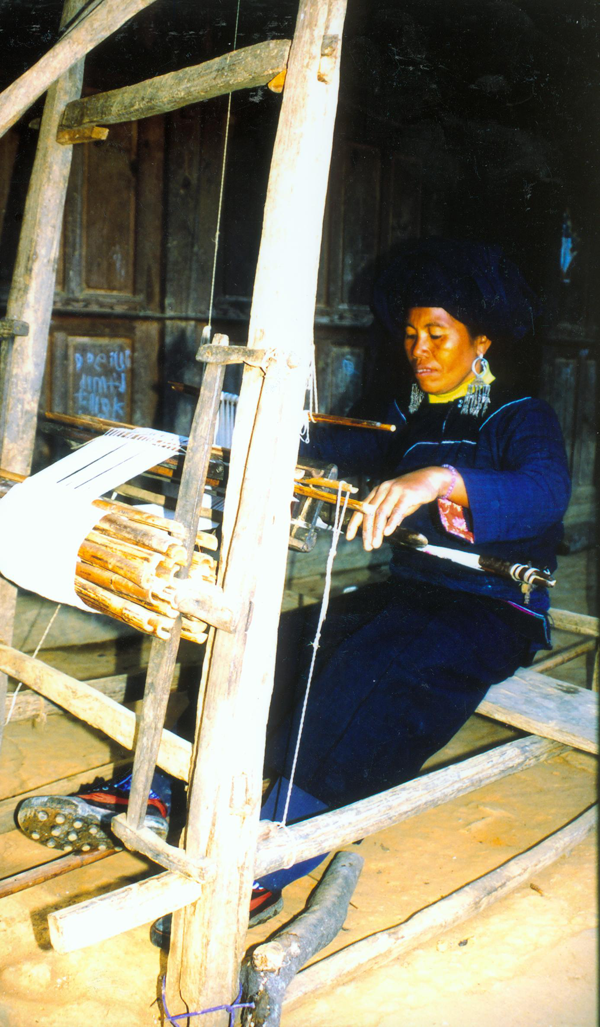 ?。?)染色。布朗族的印染技術(shù)比較單一,所使用的染色原料是自家栽種的藍(lán)靛和各種野生植物。根據(jù)所需顏色采用不同的植物,如染藍(lán)色取自藍(lán)靛,染黃色取自黃花汁。制作靛墨的程序是用水把藍(lán)靛的葉、莖泡化,撈去渣滓待其沉淀。染布時(shí),再配上一種樹皮,一起置于鐵鍋熬成藍(lán)汁,然后將白線或白布放入鍋中,反復(fù)熬煮幾次即成藍(lán)線或藍(lán)布。