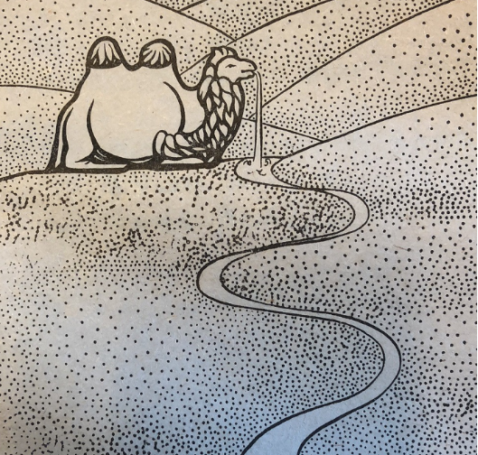 高興之際,大家想起了馱經馱水土的駱駝;但是人們四下里一看,白駱駝不見了。真是,為了找水喝竟把勞苦功高的駱駝丟失了!大家找呀,找呀,找了一夜還沒找到,天亮時,又回到燒茶的地方,然后順水而上,繼續尋找。走不多遠,發現駱駝在前面靜靜地臥著,人們高興極了,有一個人三步兩步跑上去拉駱駝,可是駱駝一動也不動。眾人上前詳細一看,白駱駝已變成了石頭。那石駱駝在水里臥著,一股清水從它的嘴里噴出來,散發看清香的氣味,流向遠方。