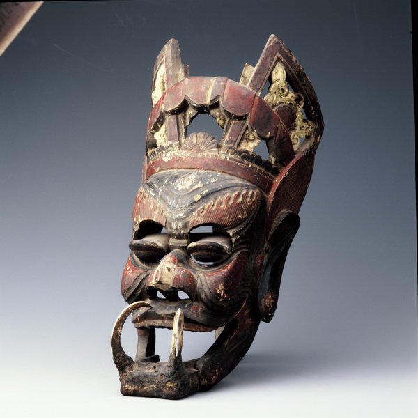 現(xiàn)珍藏于民族文化宮博物館的這件仡佬族儺面具“山王”,清代,長48厘米,寬20厘米,木質(zhì),征集于貴州道...