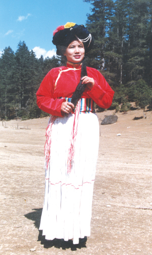 寧蒗地區的普米婦女多穿束腰、多褶的百褶裙,常用白藍等色的棉麻布制成,裙長幾乎拖至腳面。活動時,她們將裙子從左面提起,掖在腰間。