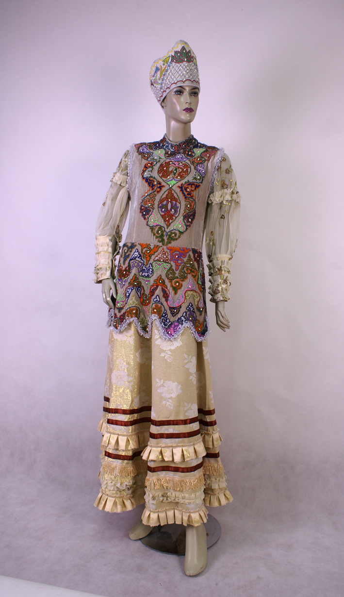 俄羅斯族女性的服飾則更多的體現(xiàn)了女性美,她們?cè)谥卮蠊?jié)慶或節(jié)日時(shí)會(huì)穿上絲綢質(zhì)地的繡花襯衣,外面再套穿一件無(wú)袖、腰身較高的對(duì)襟長(zhǎng)衫,下身一般穿著毛織長(zhǎng)裙。俄羅斯族女子也十分喜愛(ài)穿長(zhǎng)筒皮靴或氈靴。俄羅斯族女性的發(fā)飾也視年齡的不同而有所差異,少女梳獨(dú)辮,把彩色發(fā)帶和小玻璃球編在辮子里,頭發(fā)可外露。已婚婦女則梳兩條辮子,盤(pán)于頭頂,再用頭巾或帽子罩上。