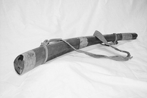 這只紅松木質地的鹿哨呈牛角形,中間鏤空,以細鱗魚皮熬膠粘合,頭部細,尾部粗,呈喇叭狀;在頭、尾、中間箍三道箍,在接近頭尾的兩端纏細皮繩為環,環上系寬皮帶,便于出獵時背挎于肩或平時懸掛。它在現存同類器物中制作時間較早,源流、傳承清晰。在它質樸的外表下,集中體現了北方狩獵民族的生活經驗、創造智慧以及審美觀念。