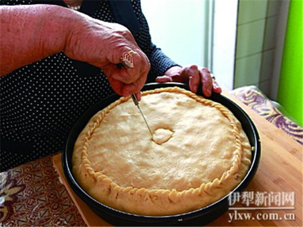 這段時間,就可以拌餡了。買斯胡旦向先前放在一旁的羊肉、土豆和洋蔥中加入一些鹽和黑胡椒粉,攪拌均勻。肉與黑胡椒粉相融的辛辣香味已經開始漫溢。接著繼續揉面。將醒好的面分成大小兩塊。大的做底,小的做頂。待大小兩塊面都搟成圓形薄餅狀后,就將底子鋪在托盤底部,多出的部分緊緊扣合托盤邊緣。然后倒入餡料,鋪平,加蓋,將上下兩層面餅悉心捏合成好看的花邊。最后,在面餅中間掏個洞,切下的面團做成小壺蓋,再原位放到上面。壺蓋的作用在于等面餅烤至表層泛紅時,將其端出,取下壺蓋,加些許開水進去。“拜列西很厚,里面的料很多,要是水干了,就不容易熟。”買斯胡旦解釋。做完這一切,就可以將托盤放進烤箱了,調整烤箱至200℃的火力就夠,這樣,經過2個小時的烘烤,外酥內軟,香而不焦的拜列西就烤好了。