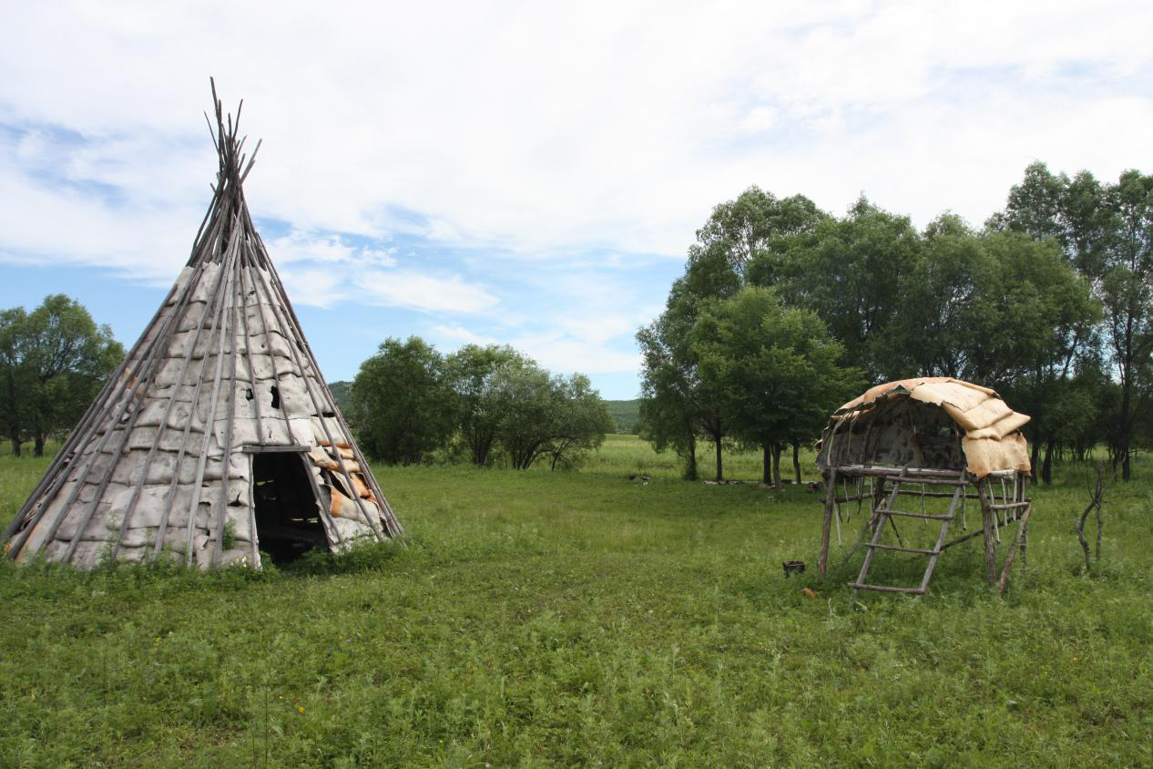 鄂倫春人還有兩種比較固定的住房,一種是“烏頓柱”,也就是土窯子或地窨子。選擇一個朝陽山坡,順坡地挖一個一米多深的坑,呈凹形,三面坑壁為房框,上面架梁,前面安門窗。還有一種是“木刻楞”,選直徑約30厘米的圓木,截成長度相等的樹段,把每一根樹段的兩面都砍平,兩端還要砍出相同規格的凸形和凹槽,然后一層一層往上垛,垛時使兩端的凸凹相互咬合,這樣垛成房框,無需釘釘,非常牢實。這兩種住房里面都可以搭火炕和爐灶,主要用來過冬。夏天還有兩種簡易住房,鄂倫春語叫“林盤”和“庫米”,就是兩種樺皮棚,一般搭蓋在“烏頓柱”、木刻楞和“斜仁柱”的旁邊,主要用以盛夏避暑。
