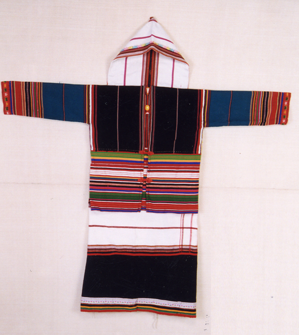 基諾族婦女上衣為無領(lǐng)對(duì)開,上半部多采用黑布或白布,下半部及衣袖用紅、藍(lán)、黃、白等7色布配制或刺繡而成,用紅色鑲邊,上衣背部縫一塊約3寸見方的白布,上面繡有圓形太陽花式圖案(基諾族稱月亮花);內(nèi)衣為上部呈方形下呈菱形的兜肚式緊身衣,上部方形為鮮艷的條飾花紋,下部菱形繡著各式圖案。下身多著紅色鑲邊的黑色合縫短裙,并用一尺左右的黑布纏綁小腿。發(fā)型為椎髻,婚前髻在腦后右方,婚后髻在前額正中。頭戴披風(fēng)式尖帽,這種尖帽用長約60公分、寬23公分的豎線花紋土布對(duì)折,縫住其一邊而成,戴時(shí)又在帽沿上折起一指許的一道邊。