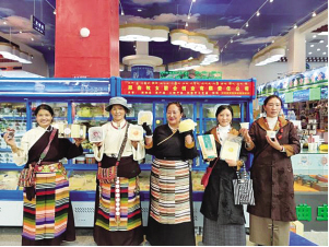 文措(左三)和“阿佳”們帶著產品參加2020年西藏脫貧攻堅產業扶貧成果展。受訪者供圖