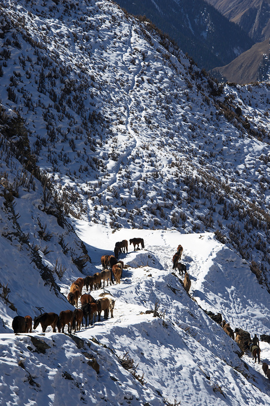 喬隆格爾冬牧場與山外的氣候差異大,暖陽如春。另一個突出特點是草好,草密的地方?jīng)]膝,縱橫倒伏一片,比南方秋田摞在一起的蒲草都密實??諝馇邃?,腐草味兒、上一年遺留的畜糞味兒和著遠(yuǎn)處高大冰崖透散過來的寒氣撲面而來,最突出的還有野生動物的腥氣,牧羊犬夜夜不停地叫聲在告訴你它們往復(fù)經(jīng)過的頻率。山上能看到大角的北山羊,野鵪鶉被驚到嘩啦啦地飛起一片。若是誰家的羊死了扔在野外,幾天都能看到禿鷲在天空盤旋。最不可思議的是雪豹,光顧一次造成的損失遠(yuǎn)比一群狼大。
