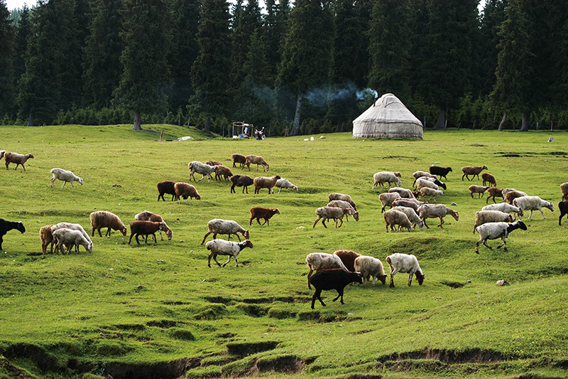 到了牧場,人們選有水有草的地方扎下帳篷。水與草是先祖們在多年前選擇生存地時的必要條件。水,可以供人畜飲用;草,可以供牛羊啃食。這時候,牧民們各自選一個地方將牛羊分開,讓它們在山野里去吃草。今年的草已經全部長出,牛羊們開始了又一次盛宴。
