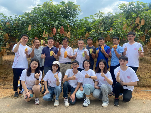 一是恩樂鎮(zhèn)復(fù)興村晚熟芒果基地調(diào)研。9月3日上午實踐團前往恩樂鎮(zhèn)復(fù)興村晚熟芒果基地考察,了解該基地的主要栽培品種,提出當?shù)孛⒐耘嗟膬?yōu)勢及目前亟需解決的問題,并為農(nóng)戶進行相關(guān)栽培技術(shù)的講解,為當?shù)赝硎烀⒐毣芾硖峁┘夹g(shù)支撐。同時實踐團選取不同海拔生長旺盛、豐產(chǎn)、穩(wěn)產(chǎn)的成年樹,隨機采摘果形均勻、健康飽滿、無機械損傷和病蟲害的成熟果,以及套上不同果袋子的果實,如白袋、紅袋和黃袋,所有樣品采摘后立即送回實驗室,對其單果重,果實縱徑、橫徑、厚度、總可溶性固形物、果形指數(shù)及風味等綜合性狀進行測定,探究不同海拔和果袋對芒果果實品質(zhì)的影響,以期為生產(chǎn)實踐提供理論指導(dǎo),提高果實品質(zhì)。