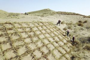 在甘肅省古浪縣北部沙區旱麻崗治沙點,八步沙林場治沙人和群眾一起扎草方格壓沙。 新華社記者 范培珅攝