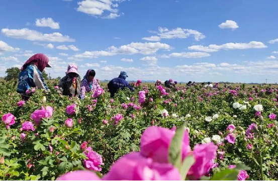 在阿舍鄉(xiāng)清香玫瑰合作社的玫瑰花茶基地里,玫瑰花姹紫嫣紅,爭(zhēng)奇斗艷,美不勝收。為了搶抓玫瑰花采摘最佳時(shí)間,花農(nóng)早晨5點(diǎn)多就已經(jīng)忙活起來,他們穿行于花海之間,背著籮筐興高采烈地采摘今年的第一波玫瑰花。