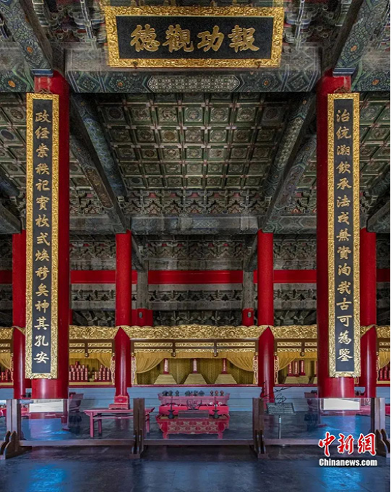 歷代帝王廟景德崇圣殿內景匾額與楹聯。(中新社發 許偉 供圖)