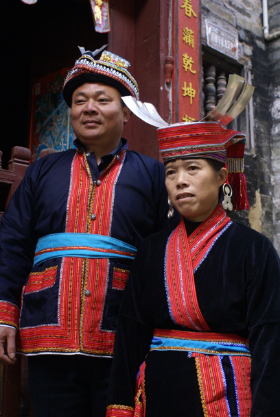 瑤族支系眾多,大凡自稱不同,服裝則有異,在這里就簡單介紹幾種最具特色的瑤族服飾。自稱為“勉”(他稱“盤瑤”或“過山瑤”)的瑤族,分布廣,人口多,其服飾樣式最多。僅頭飾就有頂板、尖頭、平頭和包頭四種頭型。婦女服裝用藍靛染成的布土制成,腰部以上的兩邊衣襟繡有八至十種圖案。上衣無扣,用兩丈多長的黑布作腰帶,腰系圍裙,前胸掛銀牌、項鏈、周圍鑲有成串的紅絨球,頭纏精美的長條彩帶。男子穿著對襟布扣唐裝,以黑布包頭。“勉”族系八排瑤的服飾,獨樹一幟。八排瑤男女頭上都插有一根或數根白翎,象征英雄殺敵的利劍。男女均穿無領無扣子琵琶式襟服,腰束布袋,褲長稍過膝。男子身上常背一個五顏六色的繡花挎袋,大都為情人所贈之物。盛裝時,全身上下佩戴精美銀飾,走路叮當作響,甚是悅耳。婦女一般都喜歡佩戴耳環、手鐲、戒指、頸圈之類的器飾。器飾式樣多種,有的奇色異型,富有特點。
