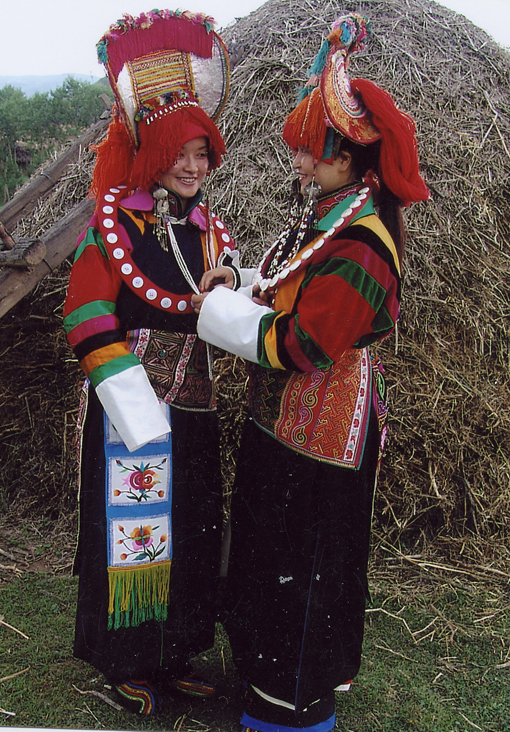 土族婦女服飾樣式繁多、色彩絢麗。頭飾大致有扭達、氈帽、禮帽、包頭等。扭達是土族婦女的主要頭飾,有學者認為,可能是由古代的頭盔、戎裝演變而來。扭達種類很多,其中以互助、大通等地的“吐渾扭達”最為古老、尊貴。因“吐渾扭達”形似圓餅,也被稱作“干糧頭”。實際上,“吐渾扭達”為圓形布坯,以彩色布條鑲出圖案,邊緣飾以彩穗,背面上沿密密的插以鋼針,非常艷麗而華貴。土族婦女穿“秀蘇”,即花袖衫,俗稱“七彩袖”。長衫為繡花小領斜襟,兩袖用紅、黃、藍、綠、紫、黑、白七色布縫制。長衫上一般套穿黑色、藍色或紫紅色鑲花邊坎肩,腰系彩帶,腰帶左側通常系有小鈴鐺。土族婦女著褲裝或裙裝。褲子也多為大襠褲,褲子膝下部分套黑色或藍色的褲筒,土語叫“貼彎”。土族婦女的裙裝在土語中稱為“胡爾美”,一種是互助等地的紅色蝴蝶裙,另一種則是民和地區的百褶花裙,顏色艷麗、美觀大方。土族女士鞋通稱為“恰繞”,又可分為“腰鞋”“拉云子鞋”“其吉得鞋”等。各種“恰繞”等縫接腰襪,鞋尖飾彩色短穗,后跟縫合處接三指大小紅布溜跟。土族婦女還喜歡戴耳墜、耳環和項圈等首飾。婦女所戴項圈,土語中稱“索爾”,由硬質的布片和金屬片制成。老年婦女的服飾不似青年婦女鮮艷多彩,主要穿小領、斜襟長衫以及素色的坎肩、圓氈帽、“過家”鞋等。