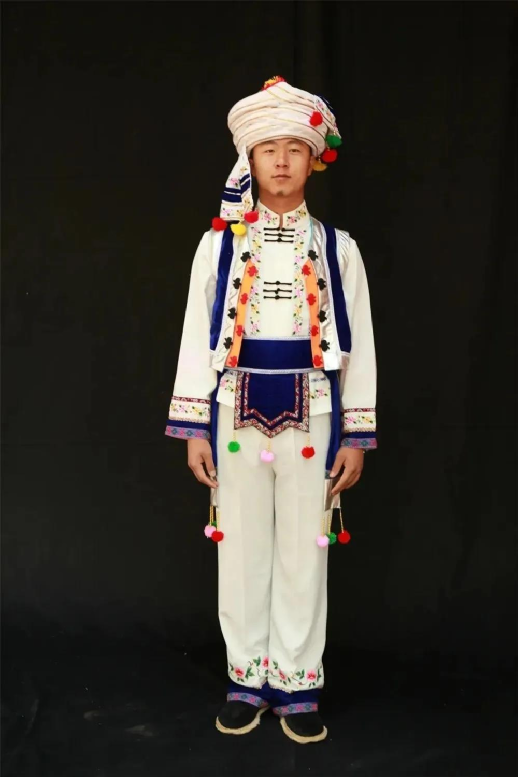 白族有著尚白的傳統,白族男子喜纏白色或藍色包頭,多穿白色對襟上衣,外套黑領褂,下身穿寬筒褲,系拖須褲帶,腳穿剪刀口布鞋,有的還佩帶繡有美麗圖案的掛包,顯得敦厚英俊,灑脫大方。