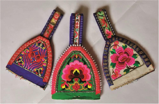 一般在包頭、袖口、前襟、圍腰以及飄帶上都要繡上精美的圖案,挑花紋樣以蝴蝶紋、菊花紋、梅花紋為主,寓意吉祥、五彩斑斕。