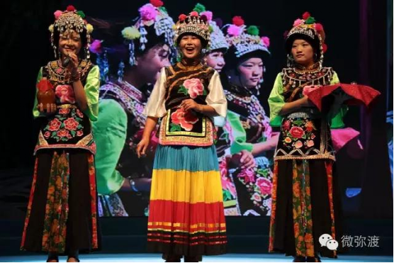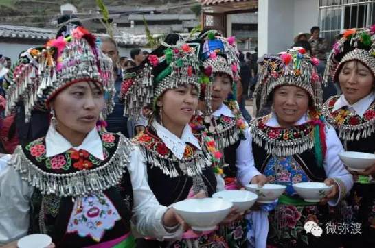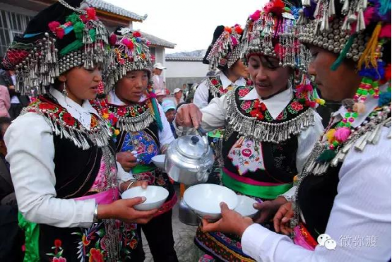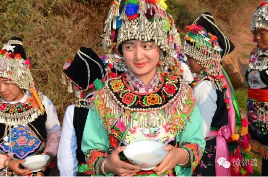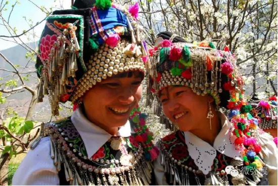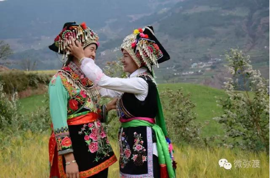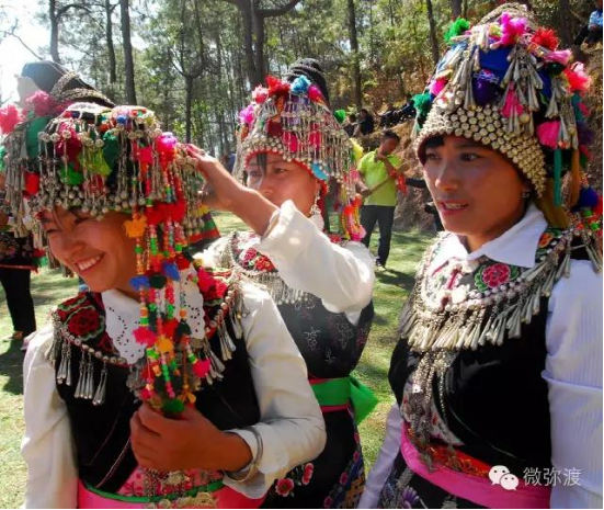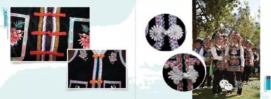 “羅羅潑支”男女服飾的特點:“羅羅潑”男子服飾與“迷撒潑”相差無幾,一般不戴白頭巾。但是婦女的服飾相差卻很大,明顯保留著古樸高雅的南詔遺風。頭飾由桂花、包頭、飄帶、大墜子、蜜蜂墜、芝麻鈴組成。桂花墊子在裱布上蒙黑色面料,中間訂有銀飾。包頭以黑色為主,長約2米,后鏈系于包頭,鏈子為銀制。飄帶長約4尺,黑色留花邊,兩頭訂英蘇。包頭還系有大墜子、蜜蜂墜各一對,芝麻鈴20個。領合由裱布黑色面料上訂芝麻玲20個圍在脖子上。圍腰的前胸部,由領口至腹部,左右各垂掛一條綴有串珠、針筒、響篾(口弦)一類飾品和生活用品的銀質項鏈。人一走動,全身的小蘇鈴就響,聲音悅耳動聽,形象美觀大方。額頭前還圍有一塊翠綠色的“桂花綁”,綁上釘有銀質小泡泡200多顆,羅羅潑支婦女的服飾彰顯華麗之美。