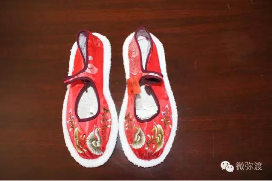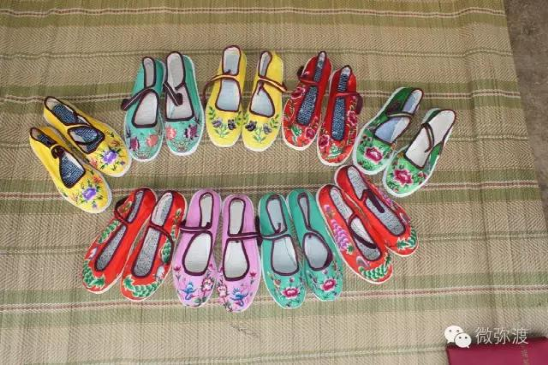 繡花鞋分大口鞋、小口鞋兩種。大口鞋大方素雅,小口鞋古樸艷麗。花樣有“峰趕梅”、“喜鵲登枝”、“獅子滾雪球“、“鳳穿牡丹”和彝族人民結婚時候,按當地風俗所需必須穿的“毛邊底”等。這些花樣圖案具有不為時代變幻所動的恒久性質,蘊藏著濃厚的傳統民俗文化。它給予人們的絕不僅僅是絢麗悅目的美感,還是彝民們征服自然,繁衍生息,爭取愛情和歡樂的記錄。