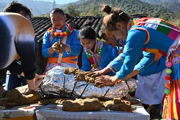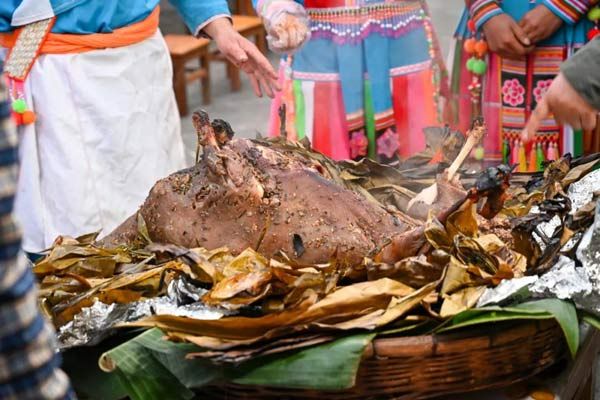 腌漬的時間越長,調料越能入味,揉好鹵汁,還要腌制個把小時。房屋后面,也是一派繁忙的景象,挖土坑,摔膠泥,大家都在為這一道隆重的美食做著準備工作。全羊用野芭蕉葉、草果葉或大粽葉、大竹葉捆裹停當,用膠泥裹糊嚴實,挖一土坑,先放入一堆柴火燒起,把土坑徹底燒熱,再把土包羊放到土坑里,土包羊上下左右堆放滿柴火開始燒烤,約2小時后,木柴全部化為灰燼,然后刨土覆蓋嚴嚴實實,不能透氣絲毫。