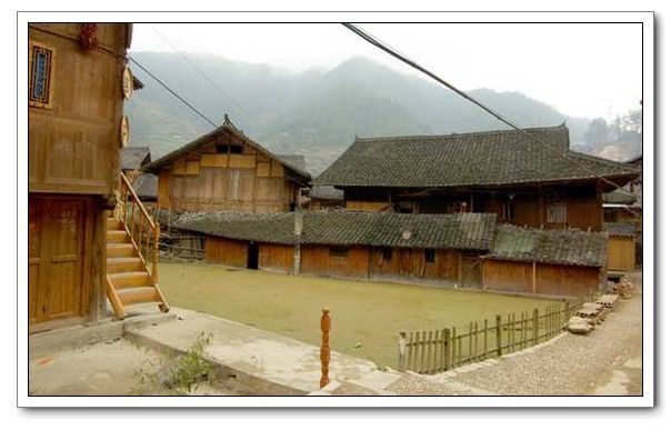 苗族山寨,村民居住的是吊腳樓。苗族大多居住在高寒山區,山高坡陡,平整、開挖地基極不容易,加上天氣陰雨多變,潮濕多霧,磚屋底層地氣很重,不宜作息起居。因而,苗族山寨歷來依山抱水,能工巧匠用本地盛產的杉木,構筑一種通風性能好的干爽的木樓,叫“吊腳樓”。苗族的吊腳樓建在斜坡上,把地削成一個“廠”字形的土臺,土臺下用長木柱支撐,按土臺高度取其一段裝上穿枋和橫梁,與土臺平行。吊腳樓低的七、八米,高者十三、四米,占地八、九十個平方米。屋頂除少數用杉木皮蓋之外,大多蓋青瓦,平順嚴密,大方整齊。吊腳樓一般以四排三至五間為一幢,有的除了正房外,外延還搭了一兩個“偏廈”。每排木柱一般9根,即五柱四瓜。每幢木樓,一般分三層,上層儲谷,中層住人,下層樓腳圍欄成圈,作堆放雜物或關養牲畜等。住人的一層,旁有木梯與樓上層和下層相接,該層設有走廊通道,約1米寬。堂屋是迎客間,兩側各間則隔為二三小間為臥室或廚房。房間寬敞明亮,門窗左右對稱。有的苗家還在側間設有火坑,冬天就在這燒火取暖。中堂前有大門,門是兩扇,兩邊各有一窗。中堂的前檐下,都裝有靠背欄桿,俗稱“美人靠”。大多數吊腳樓在二樓地基外架上懸空的走廊,作為進大門的通道。堂屋外的懸空走廊,安裝有獨特的s形曲欄靠椅,苗語叫“嘎息”(ghabxil),民間有一美稱叫“美人靠”,這是因為姑娘們常在此紡紗織布、挑花刺繡,向外展示風姿而得名。其實“嘎息”還用作一家人勞累過后休閑小憩、納涼觀景、講述傳承苗族神話和遷徙歷史,以及演唱《苗族古歌》、“嘎百福歌”的多功能涼臺。外設長廊、置板凳,便于夏夜乘涼、唱歌、閑聊。中廳設有火塘,置三腳灶,上部吊禾坑,烘烤谷物或其他食物。火塘兩頭隔開作內房,供住宿。