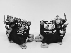 泥叫虎是山東高密的一種民間泥塑,起源于明代萬(wàn)歷初年,是形、色、聲、動(dòng)俱佳的民間工藝品,與撲灰年畫、剪紙并稱為“高密三絕”。泥叫虎腰部由牛皮連接,擠壓其頭部和尾部后,會(huì)發(fā)出響聲,叫虎一名由此而來(lái)。河南也有叫虎,又稱皮老虎。相較之下,山東的泥叫虎更具特色,而且在藝術(shù)風(fēng)格上更大氣,樣式憨態(tài)可掬,哨子發(fā)出的聲音也十分有趣。
