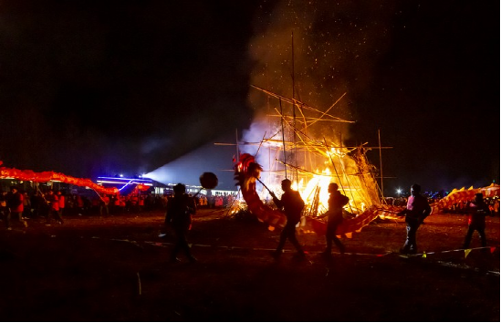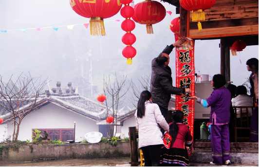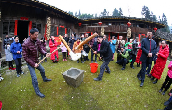 更具特色的要數正月十五趕毛狗子了。傳說毛狗子(狐貍的俗稱)喜歡偷雞吃,所以必須得趕走。趕毛狗這一天,親朋好友聚在一起,先用竹筒做成火把或用木梓油做成燈備用,再砍樹枝搭成棚子,放入草扎的毛狗子,堆放未破節的竹筒和火炮樹葉。待天黑,男女老少全部出動,在屋邊及路邊插上點燃的火把、燈,然后燒燃毛狗棚,這邊的人群發出“哦嗬”聲,那邊的人群高喊“趕毛狗子喲!”此時,滿山遍野火光沖天,叫喊聲此起彼伏,震耳欲聾,熱鬧非凡。