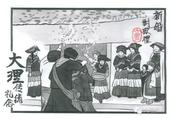 進新郎家時,新郎和新娘會對歌,新郎問新娘答,男女雙方一問一答,對歌后,方能入門。