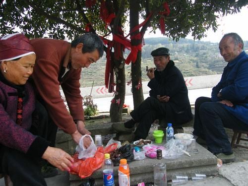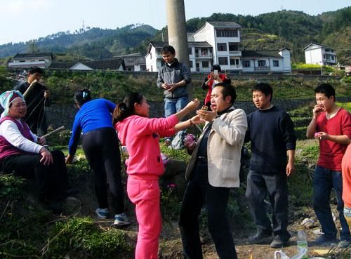 “子孫橋”落成儀式上,主人要給路人發紅蛋和敬酒勸肉