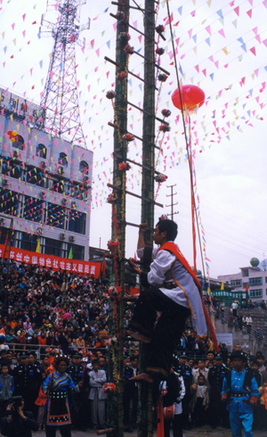 節日里,婦女們穿著鑲花邊的黑色上衣和點綴著各種銀飾物的花裙,佩戴耳環、項鏈等首飾,風采奪人。男人穿著麻布短衣褲,腰系紅黃長帶,小腿系吊簡,腰佩長刀,肩挎箭包,英姿勃勃。節目的廣場上,堅趄兩根二十米高的樹干,四周用藤蔓拉緊固定,樹桿上插有三十六把明晃晃的長刀,作為向上攀登的橫檔,刀刃向上,寒光逼人,謂之“刀竿午間。鞭炮齊鳴,鑼鼓震天”。身穿大紅抱、頭纏紅布包頭、赤腳的五名“玩火者”,齊涌至竿下,圍繞刀竿唱歌跳舞,將斟滿的白酒一飲而盡,縱身飛上刀竿。雙手緊提刀面,運足氣的腳掌斜置在鋒利的刀刃上,勇敢、靈巧地向上攀登。全場鴉雀無聲,大家屏住呼吸仰面觀看,對他們的氣功絕技贊嘆不已。噼噼啪啪的鞭炮聲來自竿頂優勝者,響徹云霄。全場歡呼跳躍,爭相向爬桿者敬獻美酒。對歌、跳舞、蕩秋千活動為節日增添了濃郁的氣氛。丟煙包(煙盒)活動別具一格,青年男女各站一方,互擲煙包,姑娘將小伙的煙包收藏起來,說明姑娘接受了小伙子的愛慕。