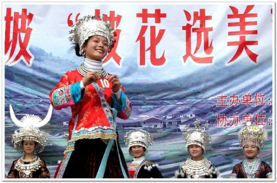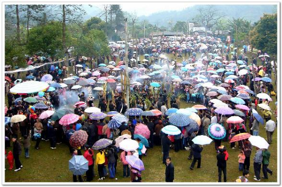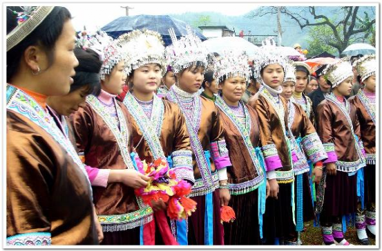 廣西融水縣的香粉古龍坡會于每年農歷正月十六舉行,所以又名“十六”坡。這一天、來自外國朋友、各地的游客及當地方圓十里的苗哥苗妹,提蘆笙,提鳥籠、牽馬匹,打花傘……朝著十六坡趕來。正午時分,山梁上、村道間、河溪旁,出現了成列成隊穿紅戴綠的人群。遠遠望去,似一條彩帶在飄動。當萬余人江集后,整個坡地就成了彩色的世界。