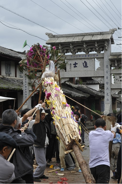 在劍川,都是由家里喜添子嗣的人家來籌備火把節(jié)的一切事宜,除了對(duì)新生兒的祝福,火把樹的裝扮也表示劍川人祈愿風(fēng)調(diào)雨順,人壽年豐、鄰里和諧。火把要扎十二層(閏年要扎十三層),上面六層的明子和柴分別由細(xì)到粗,一層接著一層,下面七層都是一樣的新柴。喻示每一個(gè)新的日子都紅紅火火。
