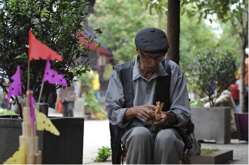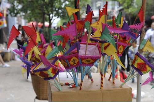 早上十點(diǎn)左右,火把就快扎好了。色彩鮮艷的紙裱斗升上各色卷著的彩旗正一個(gè)個(gè)被打開,梨、蘋果、花紅正被栓成一串串地掛在樹枝上,水泥桌上擺著小旗、炒蠶豆和糖果等,老人們?cè)谝慌赃呅吜模槐P彩色米干在燦爛的笑著。