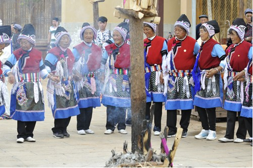 到了這一天,親友鄰居都不請(qǐng)自到來幫忙和祝賀。綁扎柴禾,做小彩旗,栓水果串等,等一切都好,再齊心合力豎起火把。等掛著果串的斗升一點(diǎn)點(diǎn)離開地面,火把樹穩(wěn)穩(wěn)當(dāng)當(dāng)挺立的時(shí)候,孩子的奶奶和外婆就在火把樹下燃起香,敬上茶酒和米干,虔誠地磕頭祈禱。