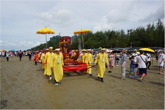今年適逢中國(guó)共產(chǎn)黨成立100周年,活動(dòng)當(dāng)天,氵萬(wàn)尾村洋溢著濃濃的愛(ài)國(guó)熱情。活動(dòng)開(kāi)始,身著京族服飾的當(dāng)?shù)卮迕駠墼谄鞐U前,舉行升國(guó)旗奏國(guó)歌儀式。隨后迎神隊(duì)伍在鑼鼓和鞭炮聲中到達(dá)海邊,將“海神”迎回哈亭敬奉,祈求人畜興旺,五谷豐登(見(jiàn)圖)。眾多慕名而來(lái)的區(qū)內(nèi)外游客集聚哈亭和海邊,與京族同胞一起歡慶這盛大的節(jié)日。