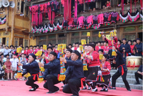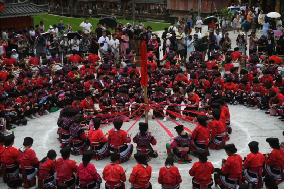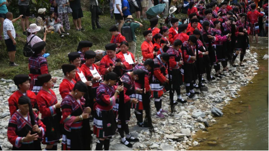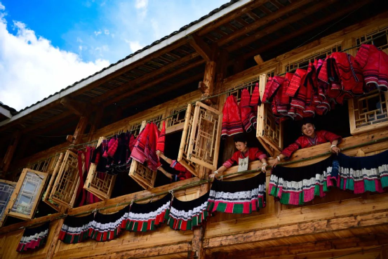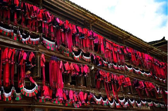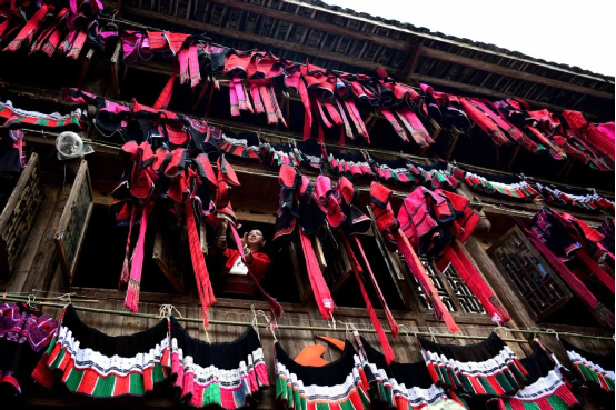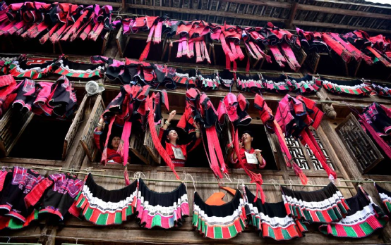 這一天,寨子里賓客盈門熱鬧異常,嫁出去的女兒和在外寨入贅的兒子都要挑著鴨子、酒和禮品,背著小孩回家吃團(tuán)圓飯,家家戶戶包粽子過大節(jié)。紅瑤姑娘和嫂子們,紛紛推開窗戶,拿出民族盛裝一件件掛在窗外晾曬,整個寨子掛滿了紅衣服,顯得格外鮮艷奪目。