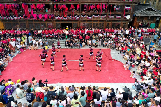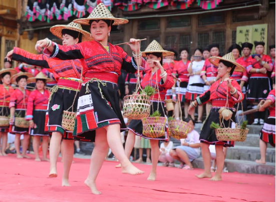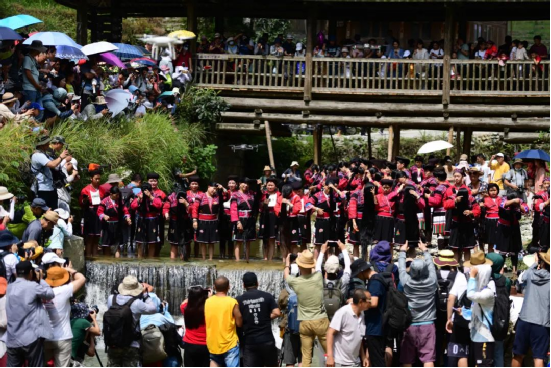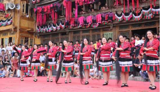 曬衣節(jié)當(dāng)天還進(jìn)行了嗩吶鑼鼓迎賓、瑤嫂長發(fā)梳妝展示、“抬金狗”送祝福、紅瑤服飾加工展示、紅瑤集體婚禮等活動,豐富多彩的民俗文化、濃郁的民族風(fēng)情,讓各地游客流連忘返。