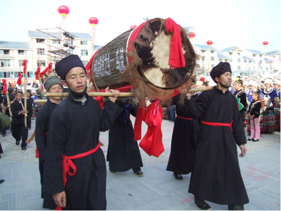 第6天(申日):下午兩三點鐘,保管銅鼓的寨老等人,燒香化紙,燃放鞭炮,用魚、肉、酒等祭鼓后,先由寨老家人踩幾圈銅鼓,然后全寨男女老少及來客(主要為女青年)跟著踩。這天,人人穿著節日盛裝,在蘆笙的伴奏下,踏著鼓點,圍圈跳蘆笙銅鼓舞。晚夜,本寨和外寨未婚男女青年在河灘等地“游方”,對唱情歌,尋覓伴侶。每天晚上的“游方”活動持續到第10天(子日)才結束,這時外寨的男女青年才依依不舍離去。