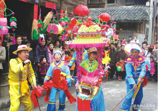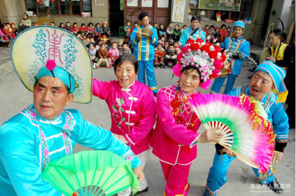 利川燈歌,又名燈調,始于清代初期,已有300多年的歷史,是人們逢年過節之時以彩龍船為道具,畫地為臺、亦唱亦演的民間藝術形式。2011年5月,利川燈歌被國務院公布為第三批國家級非物質文化遺產名錄。