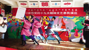 2017年12月6日,察右后旗烏蘭牧騎赴白音察干鎮(zhèn)白音淖爾嘎查進行黨的十九大宣傳慰問演出。圖為舞蹈《總書記回信了》。
