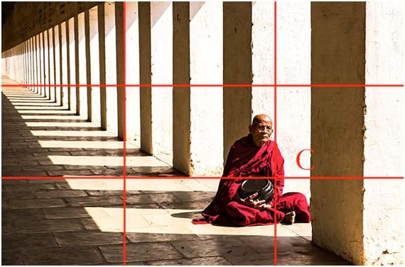 這三張圖都是就是黃金交叉點構圖的應用,第三張是在緬甸的拍的,當時這個僧人坐在有光的長廊里,他的頭不在交叉點上,但落在相對差不多的位置。